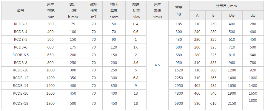 RCDB型自冷盘式电磁除铁器与PDC系列盘式电磁除铁器、RCDY系列电磁除铁器等同。是用于处理粉状或块状非磁性物料中杂铁的除铁装置。其内部采用电工专用树脂浇注,自冷式全密封结构,具有透磁大、吸力强、防尘、防雨、耐腐蚀等特点,在恶劣的环境中仍能可靠运行。行走装置的配备可由客户自己选择。