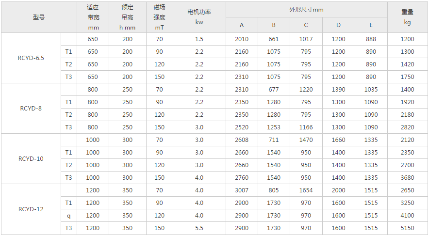 RCYD型永磁自卸式除铁器与RCYC系列型号等同,适用于各行业输送带输料除铁。可实现连续不断的吸弃铁。皮带具有自动纠偏功能,运行可靠、维护简单。其内部磁路采用完善的结构,保障整机在恶劣环境中无故障长期运行。拥有防爆型和铠装型。