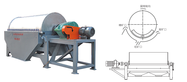 其原理是当矿浆进入磁场区时,其中强磁性矿物被吸附在圆筒表面,弱磁性和非磁性矿物被水流冲洗排出,而吸附在圆筒表面上的磁性矿物随圆筒旋转,被带出磁场区,用冲洗水冲入精矿槽中,完成分选作业。