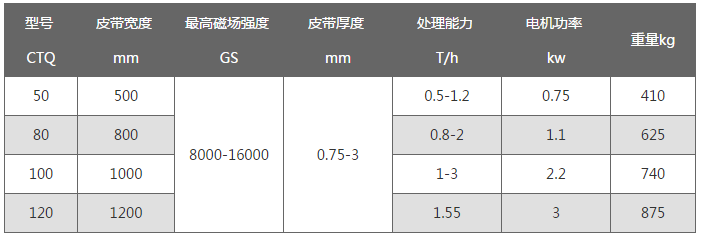 CTQ型系列辊式干式磁选机使用永磁材料,具有高磁场强度、高磁场梯度。磁辊数量可根据客户要求制作1-10辊。超薄型传送、分选胶带。磁辊受传送带保护,无磨损,不易退磁。设计入料系统,使入料更均匀,定时定量随时控制入料。简单实用的自重式平胶带张紧、纠偏机械装置。采用了新型轴向串对斥磁系结构,磁辊表面磁感应强度与电磁感应辊式强磁机相比磁场梯度高3-4倍。无气隙、物料不阻塞,入选料度最大可达50mm,分选效率高。 安装、维修及生产运行费用低,操作简便。主要应用于细粒弱磁性矿物(裼铁矿、锰矿等)抛尾或精选提纯;非金属矿物(红柱石、硅线石、蓝晶石、石榴石、长石、石英、金红石、锆英石、刚玉、金刚石等)原料及产品的精制加工;去除各种磨料产品、催化剂及其它物料中的弱磁性有害杂质。