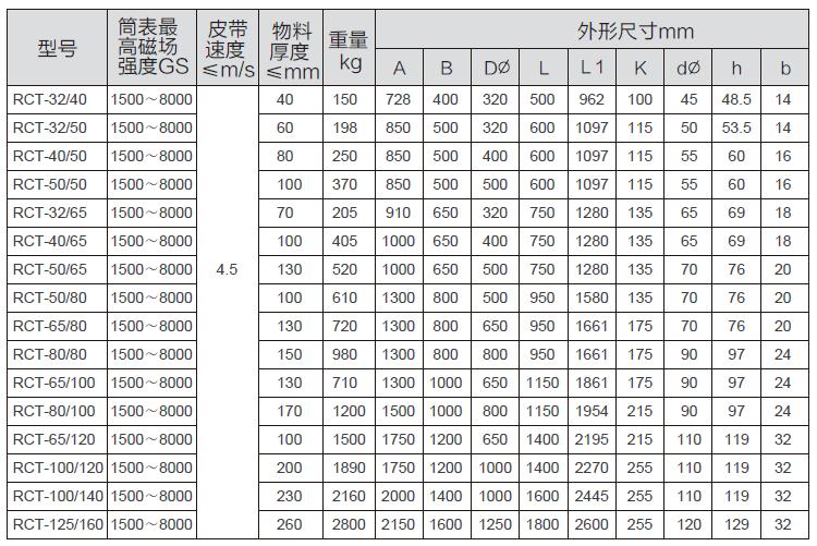 RCT型全磁滚筒与RCTG系列等同,亦称磁滑轮或干式大块磁选机。RCT型全磁滚筒其内部采用高性能强磁材料组成强力磁系,具有磁场强度高、结构简单、使用方便、不需要维修、不消耗电力,常年使用退磁率小等特点。RCT型全磁滚筒可用于水泥、磁选、矿山、钢铁、化工、耐火材料、垃圾处理等行业的选铁。